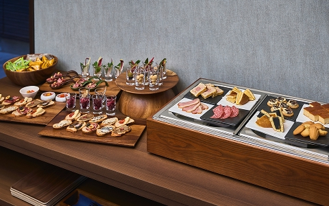 コーヒー/紅茶などのソフトドリンクからアルコールまで、お好みの一杯とともにお楽しみ頂ける軽食をご用意しております。色とりどりの前菜やスイーツをつまみながら、会話を弾ませるもよし、一人静かに味わうもよし。旅の時間に寄り添う“小さな贅沢”が、ここにはあります。